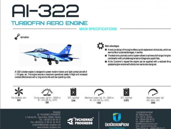 AI-322發(fā)動(dòng)機(jī)由烏克蘭“伊芙琴科-進(jìn)步”設(shè)計(jì)局研發(fā),由馬達(dá)西奇公司制造,這臺(tái)發(fā)動(dòng)機(jī)就是原來的AI-222-25發(fā)動(dòng)機(jī)的改進(jìn)型,是一種無加力的中小推力小涵道比渦扇發(fā)動(dòng)機(jī),它的無加力推力是2.5噸。AI-322還有一個(gè)帶有加力燃燒室的型號(hào),叫AI-322F,加力推力達(dá)到4.2噸,是為L(zhǎng)-15的領(lǐng)先戰(zhàn)斗訓(xùn)練型L-15B研發(fā)的,L-15B具備1.4馬赫的超音速飛行能力,可以承擔(dān)輕型戰(zhàn)斗機(jī)的部分功能。